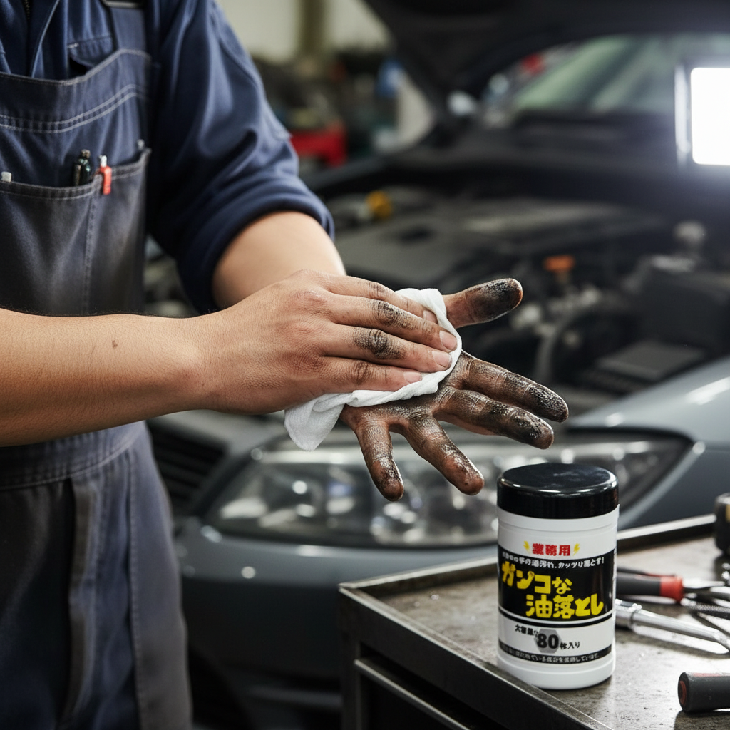 機械油で汚れた手に!